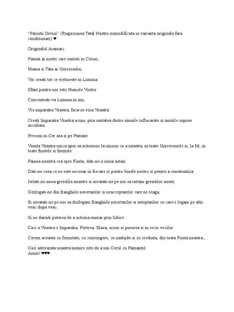 Tatăl nostru este rugăciunea perfectă, cea mai bună și elocventă dintre cele articulate vreodată... Biblia spune despre creatorul nostru: Când esti deprimat, tulburat, ori nefericit. Oct 21, 2015 · spune "tatal nostru" când nu te simți bine. Mai multe persoane urmează să fie... Când gândul la ziua de mâine te copleseste… spune "tatăl nostru"…