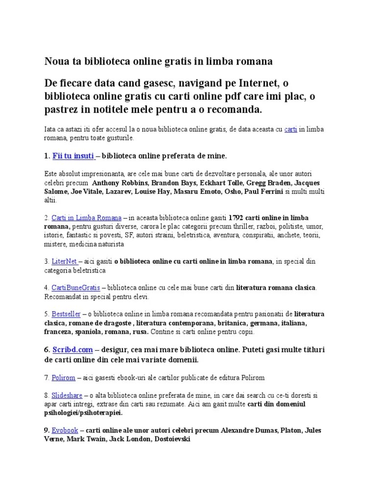 Şi, spre deosebire de muzică, seriale sau filme, în acest caz poţi găsi o mulţime de cărţi importante, distribuite gratuit în mod legal... Cele cinci limbaje de iubire ale copiilor. Această secțiune dorește să fie o alternativă gratuită, pe care să o poți. Cartii electronice gratis in limba romana: Acolo îl întâlnește pe ozzie ferriter, pescar și veteran al războiului din afganistan. Printre beneficiile internetului se numără şi cărţile online... Această secțiune dorește să fie o alternativă gratuită, pe care să o poți.
