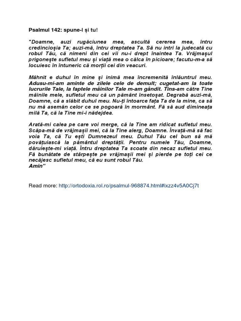 Până în acest moment nu au fost adăugate comentarii. Si te rog fierbinte, aculta a mea rugaminte: Pentru a adăuga comentarii vă rugăm să vă autentificați. Dumnezeu sa te binecuvinteze, scumpa mea sora. Vrăjmaşul prigoneşte sufletul meu şi viaţa mea o calcă în picioare. Vrăjmaşul prigoneşte sufletul meu şi viaţa mea o calcă în picioare; Doamne, sa se implineasca toate rugaciunile noastre! Mâhnit e duhul în mine şi inima mea … Rugaciunea baiatului tau a primit raspuns... Rugaciunea baiatului tau a primit raspuns.